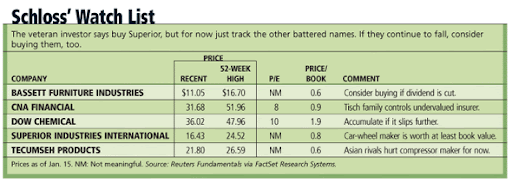 One company he's keen on now shows the Schloss method. That's the wheelmaker. Superior Industries International (nyse: SUP - news - people ) gets three-quarters of sales from ailing General Motors (nyse: GM - news - people ) and Ford. Earnings have been falling for five years. Schloss picks up a Value Line booklet from his living room table and runs his index finger across a line of numbers, spitting out the ones he likes: stock trading at 80% of book value, a 3% dividend yield, no debt. "Most people say, 'What is it going to earn next year?' I focus on assets. If you don't have a lot of debt, it's worth something."